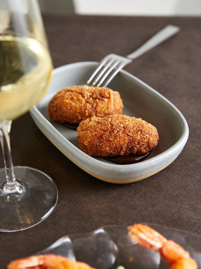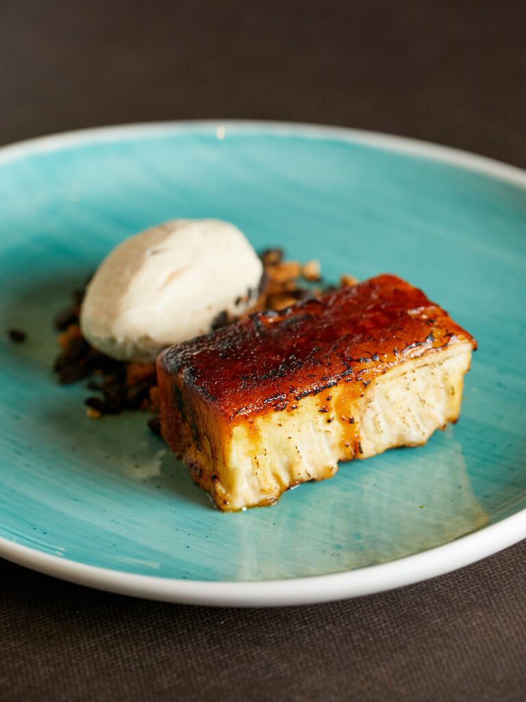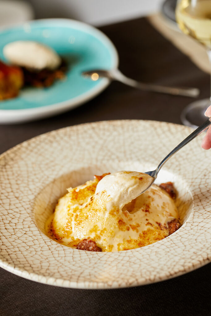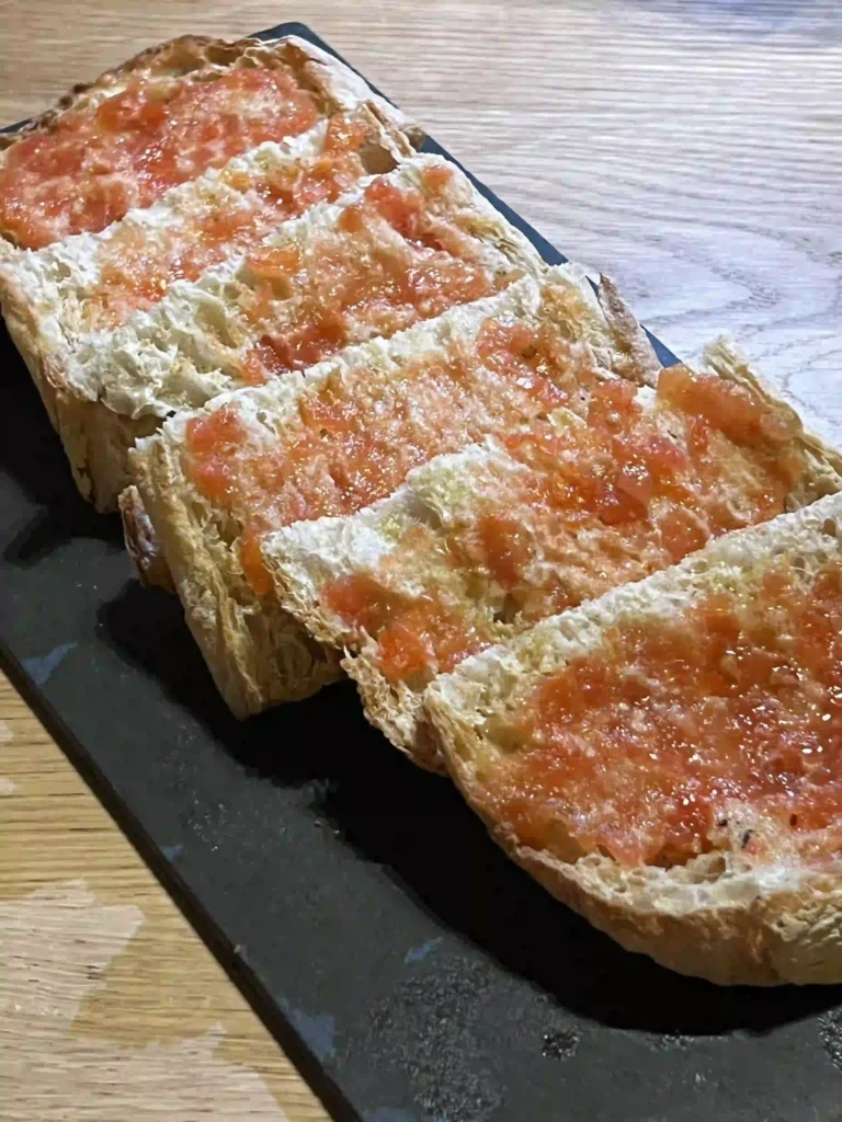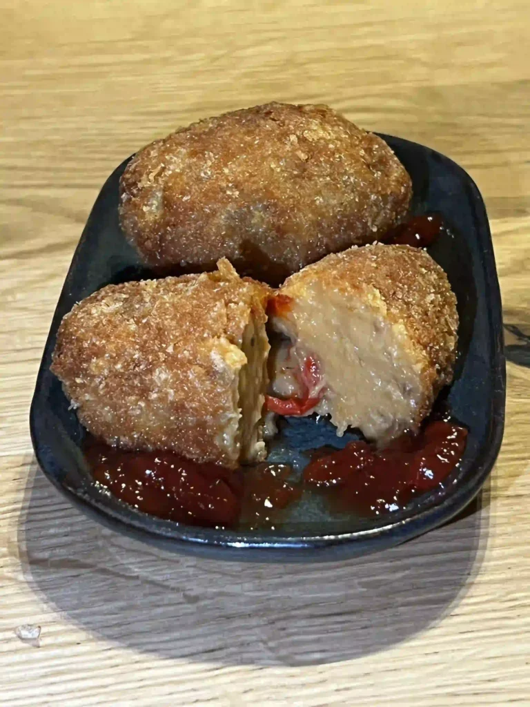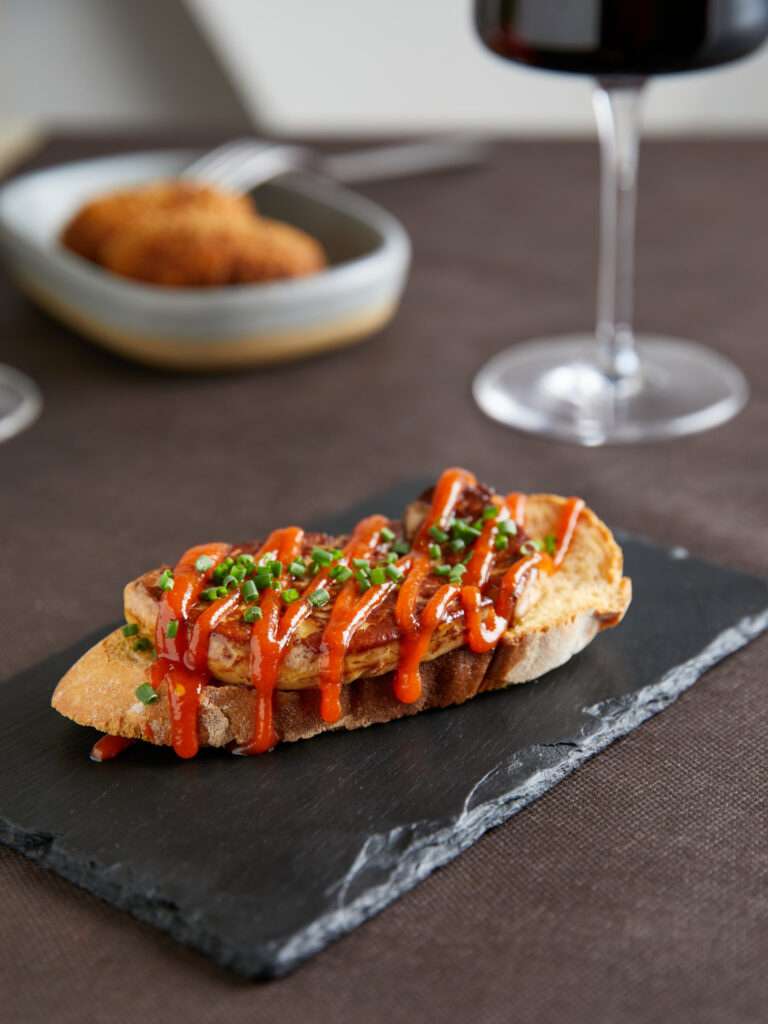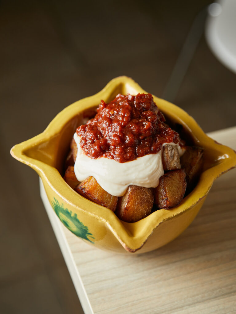 Patatas d’olot con chutney de tomate anisado y queso brie a la plancha
