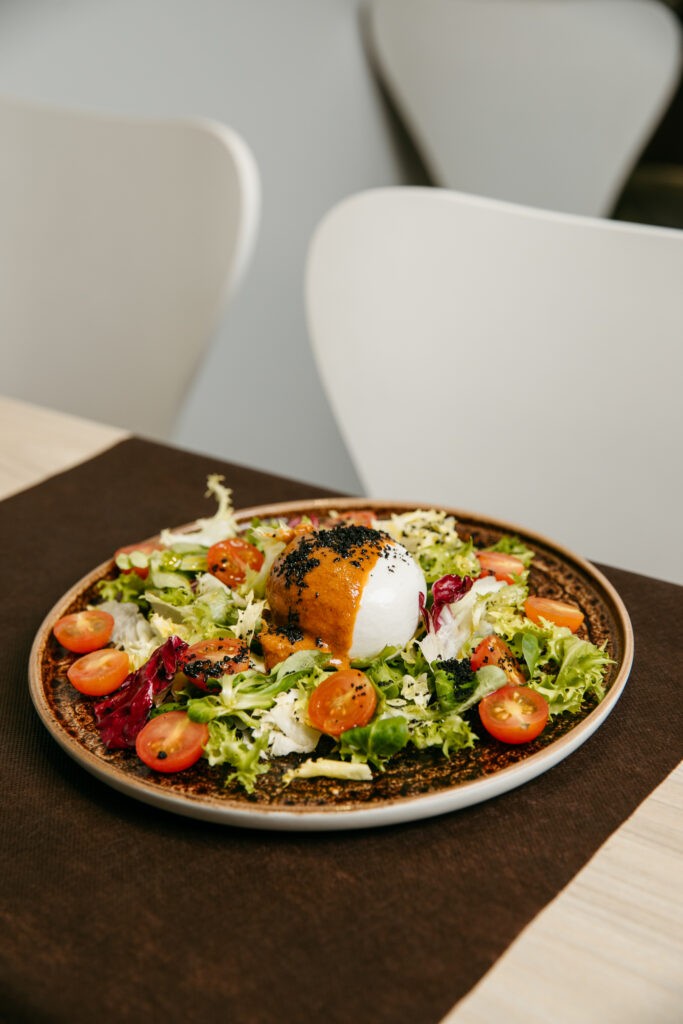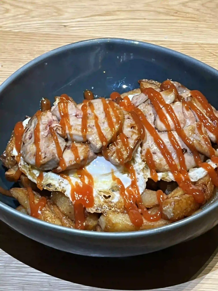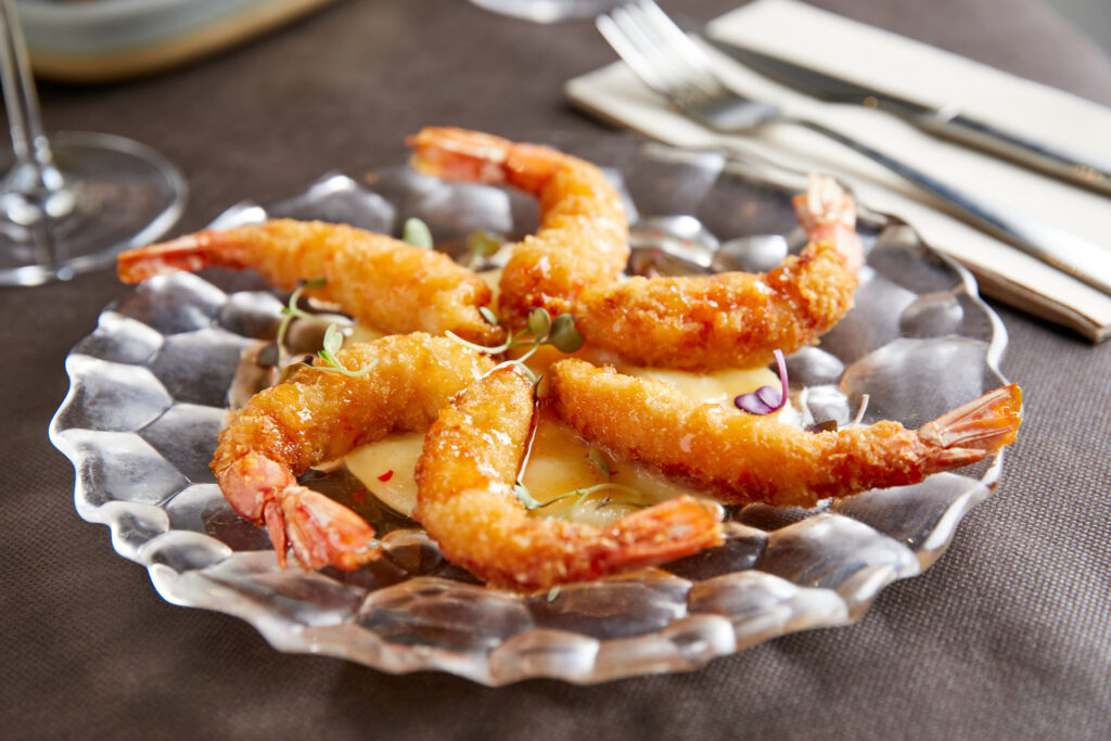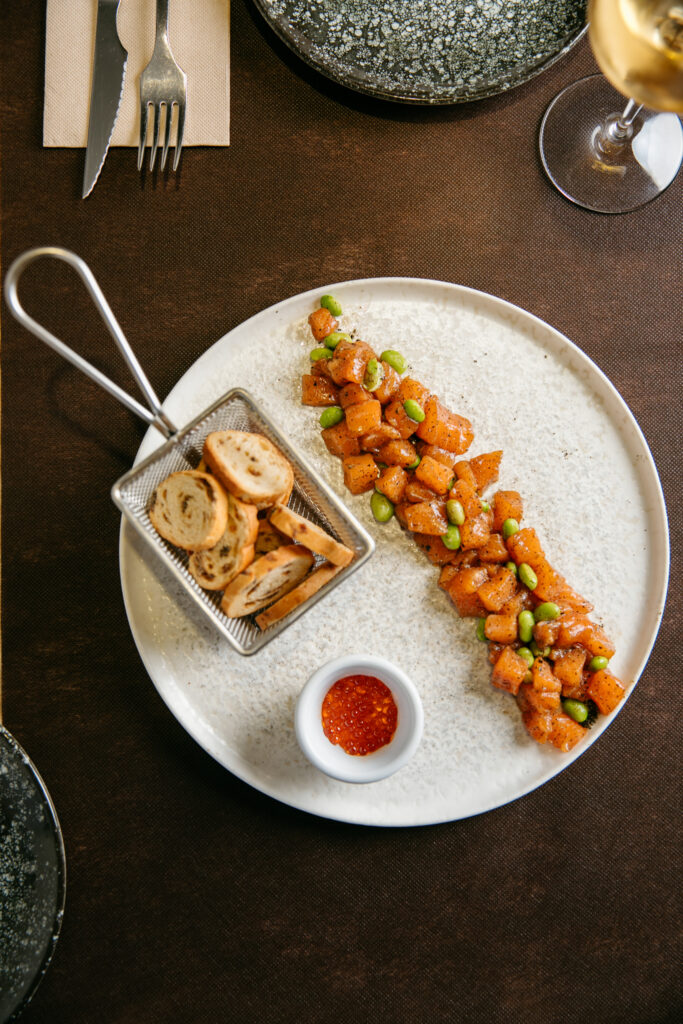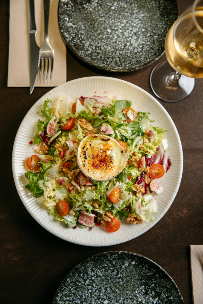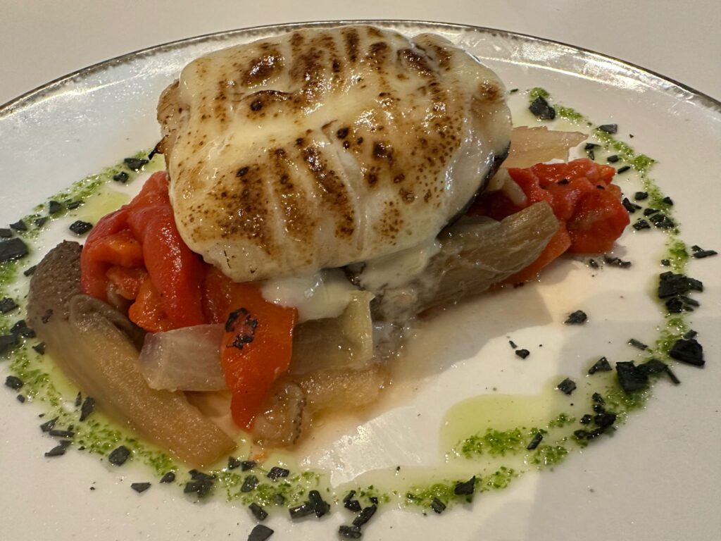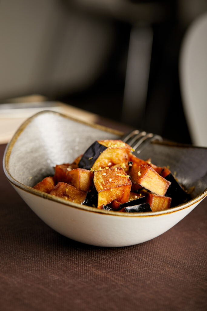 Patatas d’olot con chutney de tomate anisado y queso brie a la plancha